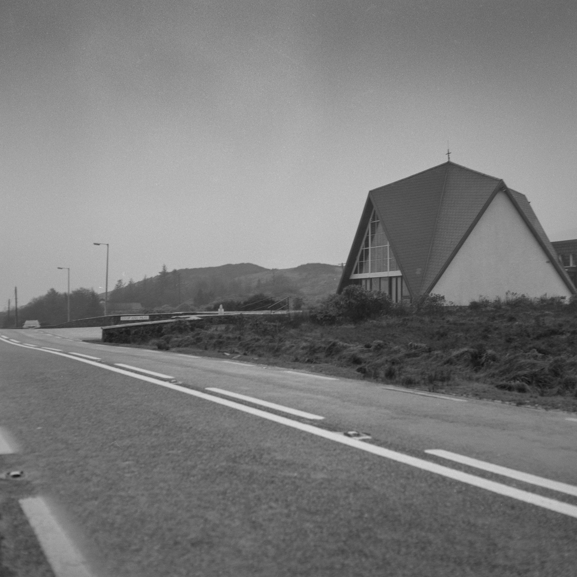 My intention was to shoot the church in its spectacular surroundings, sitting as it does in remote moorland, at the side of the road between Westport and Clifden (here’s a GoogleMaps link) but even in my full waterproofs, it would be pretty unpleasant to to get across the sodden bog to a suitable position. Also, 1970s TLRs are not known for their weatherproofing.