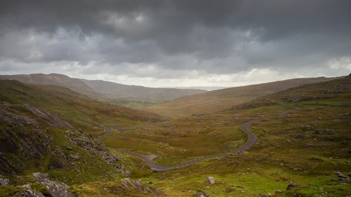 Beara sits below the more famous Dingle and Iveragh (home of the Ring of Kerry) Peninsulas and has a very different feel. There are not the high(ish) mountains of Iveragh nor as many people as Dingle. Instead, the countryside is made up of bare fields of exposed rock, surrounded by a long and varied coastline. There is a road that runs around the coastline of the peninsula and just two roads that cross from north to south, both travelling over spectacular passes.