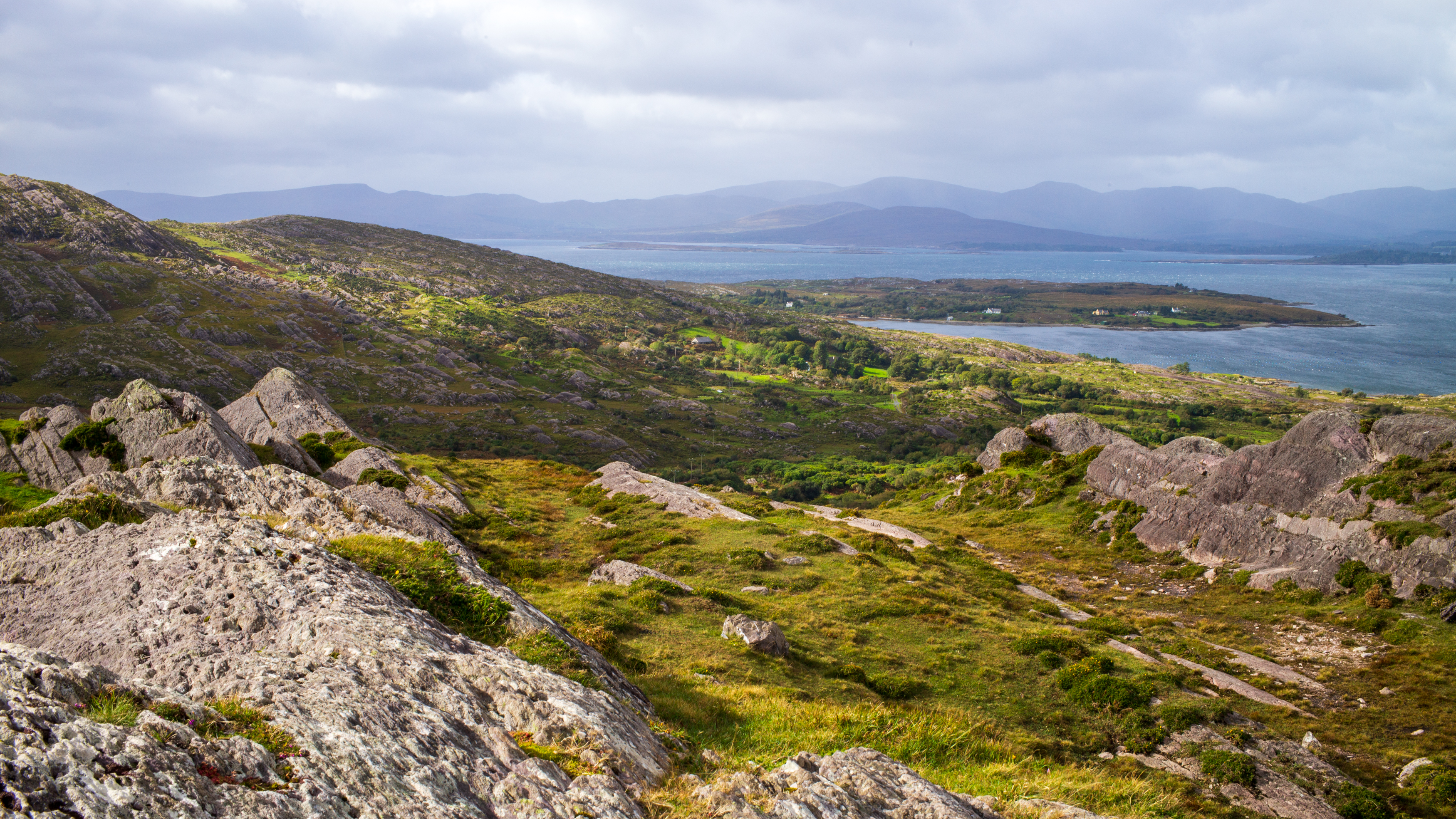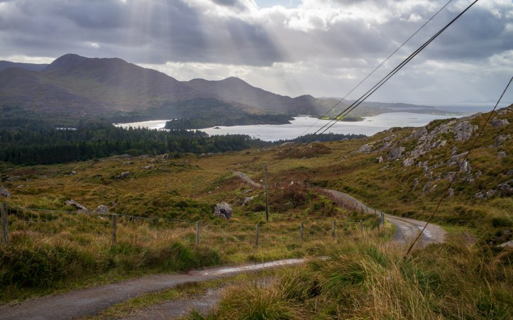 At one point of the drive, I saw a sign for Cashelkeelty stone circle and an empty lay-by. A finger post pointed invitingly over a stone wall and into some dense woodland. I decided to investigate, imagining a mysterious megalithic structure buried deep in the dark woods. It actually turned out to be a trek up a steep slope to a fairly disappointing scattering of stones. But as I turned around to start back down, the view across the river to the Ring Of Kerry was spectacular and well worth my very elevated heart rate.