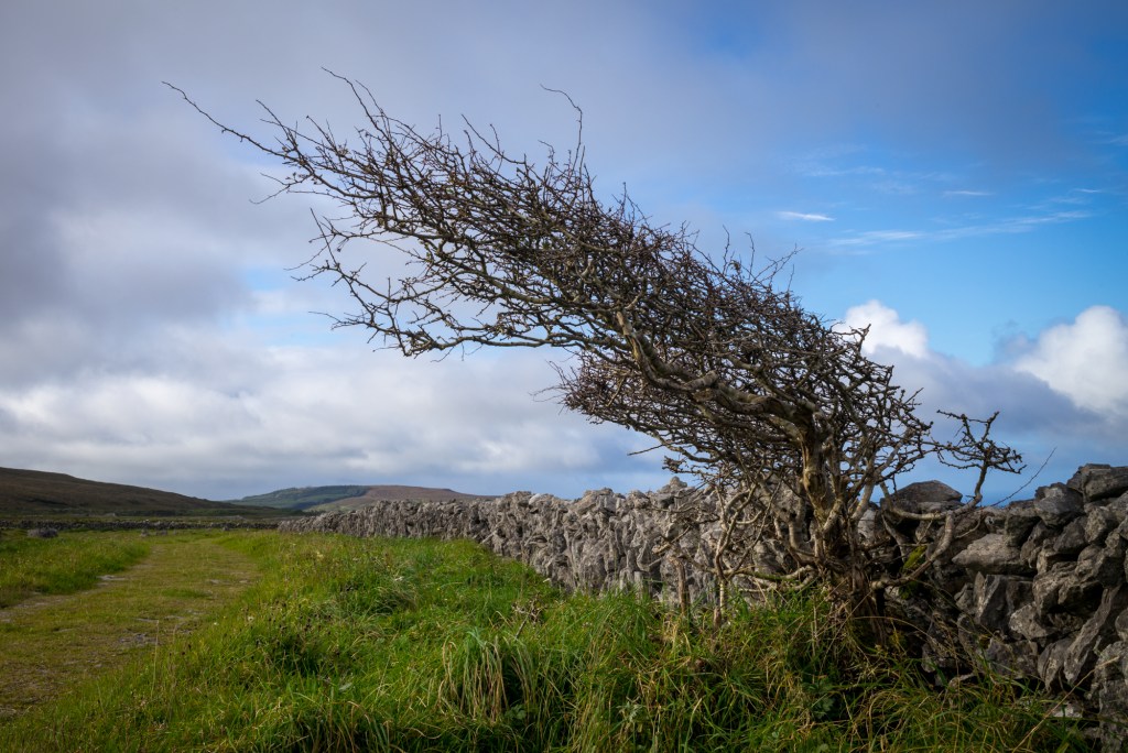 There’s not a lot of vegetation above a few inches tall on the higher parts of the Burren, as there’s not enough soil for things to grow roots. The occasional exception are these Hawthorn bushes that grow on the leeward side of walls. They are sculpted into dramatic shapes by their constant battering by the weather. I imagine that they’d make decent navigational aides as they’re always pointing away from the prevailing south-westerlys.