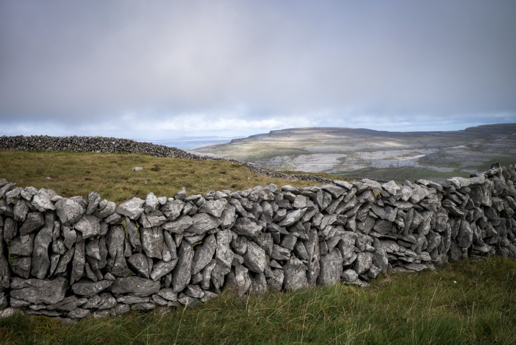 Unmistakably a Burren wall, with Gleninagh Mountain in the background.