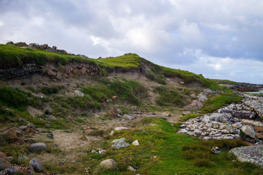 Back on the shore and this crumbling bank is home to an ancient graveyard. As the weather eats away at the hillside, human remains are often exposed. All across the island, burrowing rabbits often bring up ancient ‘debris’.