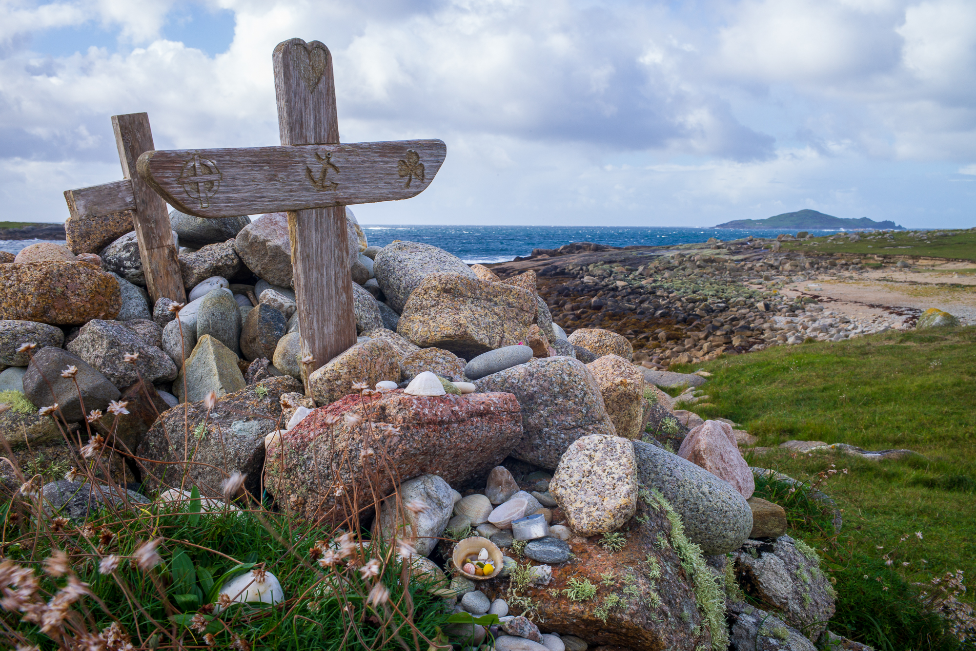 Further around the coast of Omey, past the stoney beaches to the right and machair grasslands in the centre of the island to the left, and I came to the holy well (Tobar Feichín) with all the usual offerings that these sites gather.