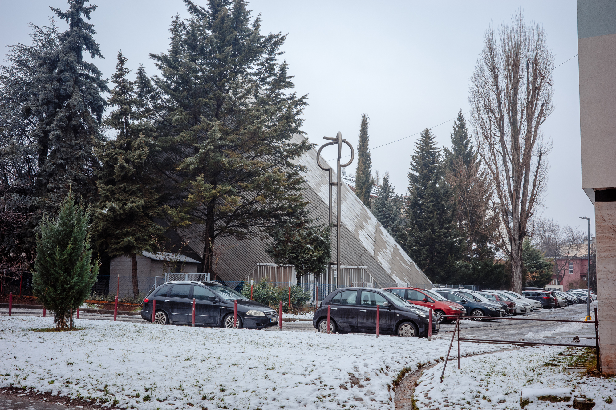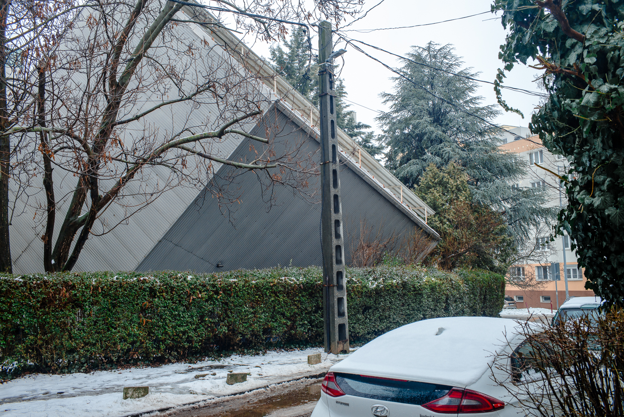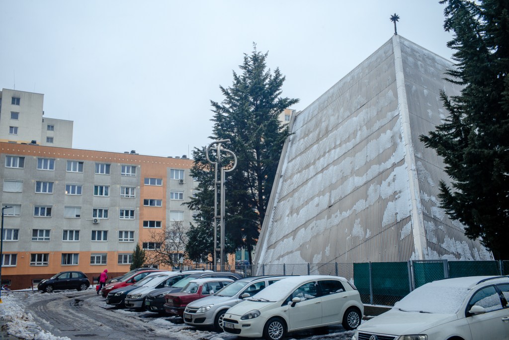 The route begins at the striking concrete station at Bikás Park, part of the glorious M4 underground line — one of my favourite pieces of transport architecture anywhere. From there the walk takes in a variety of distinctive structures, from the colourful “three sisters” tower blocks to the grey prefabricated “fat houses”, larger than the standard panel buildings, and the crashed-UFO form of the Külső-Kelenföld Reformed Church.
